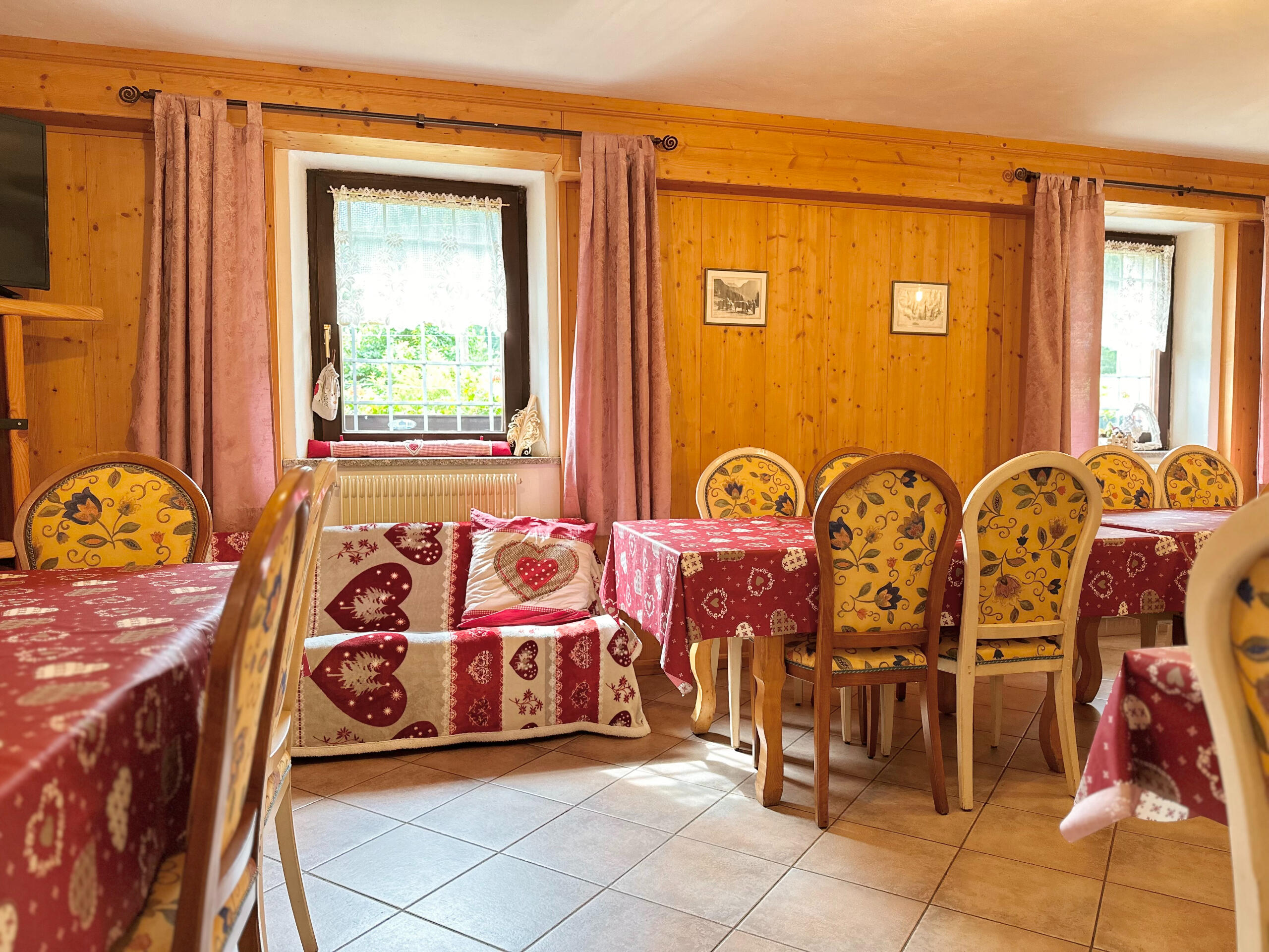 Sala da pranzo di 70 mq ad uso esclusivo, perfetta per pranzi e cene in compagnia nello Chalet Rustico Bertolini.