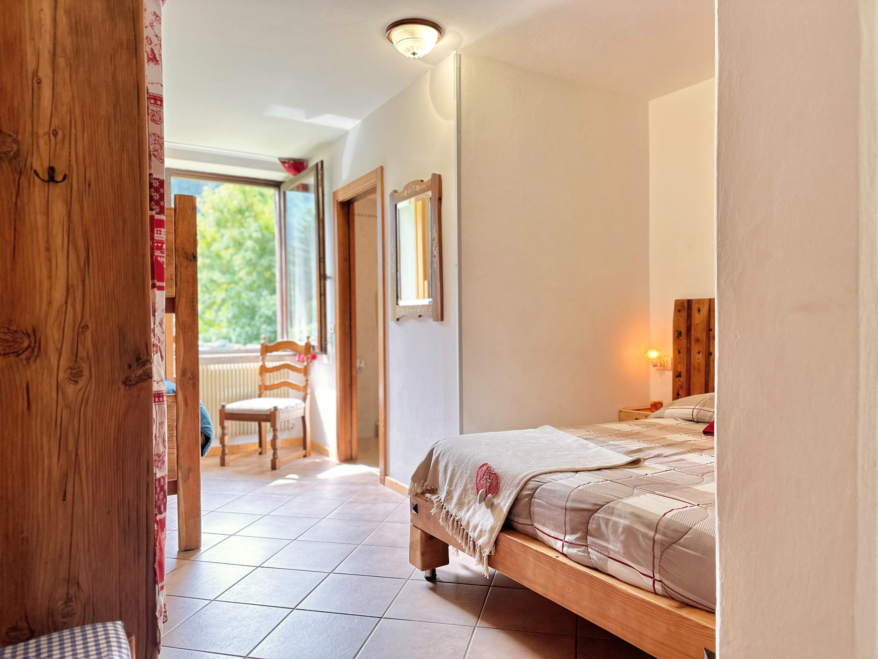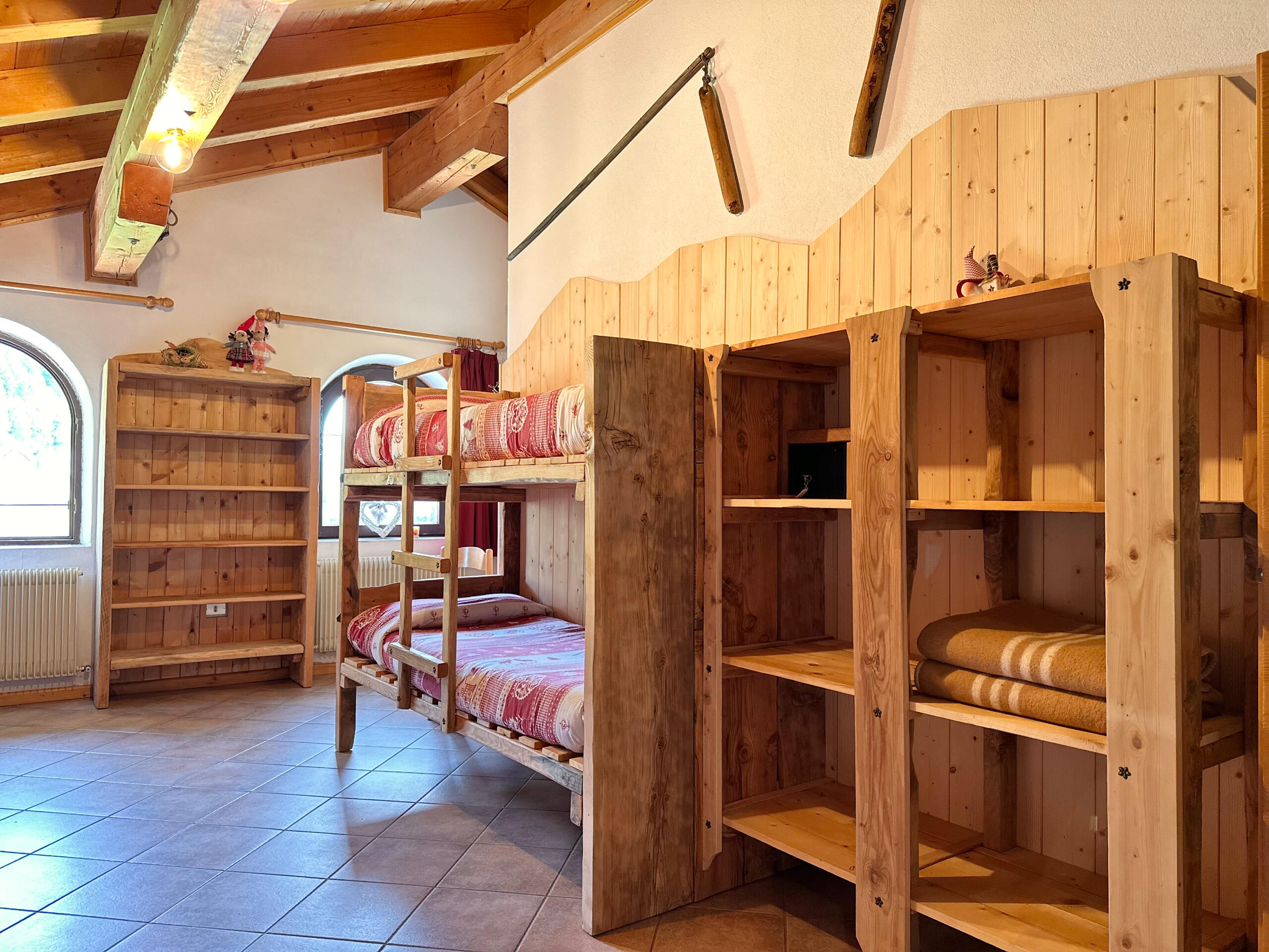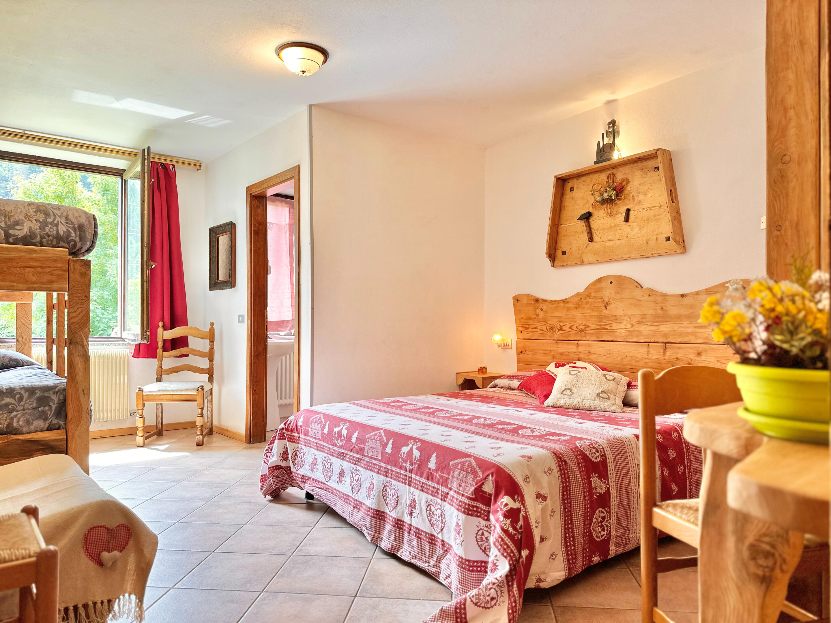 Ampia camera con letto matrimoniale + letto a castello, bagno con doccia. Mobili in legno rustico che scaldano l’ambiente.