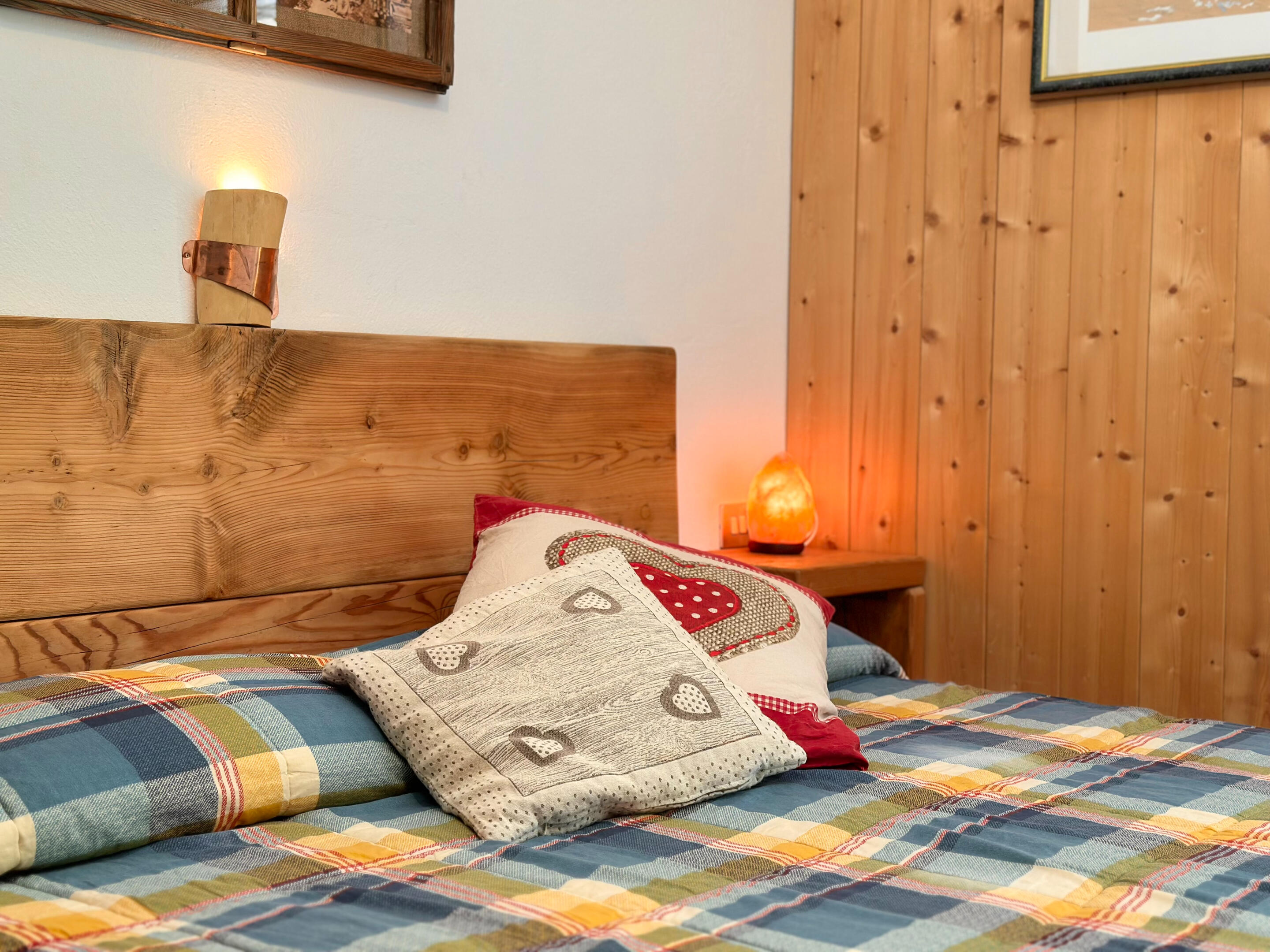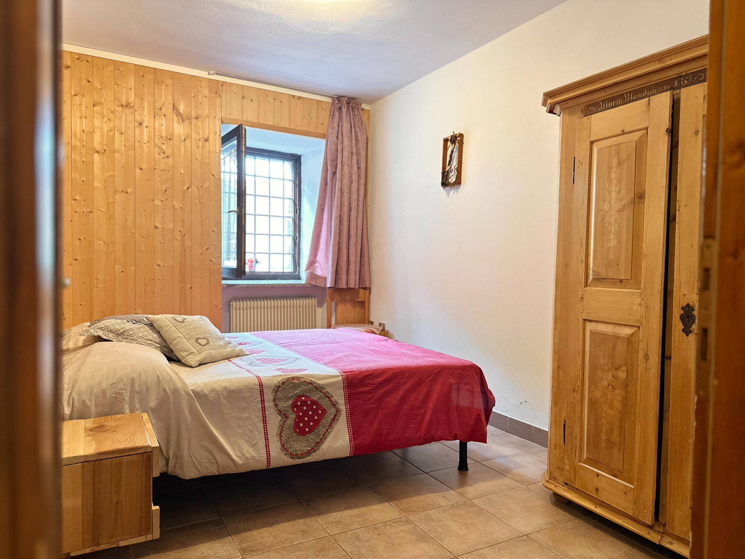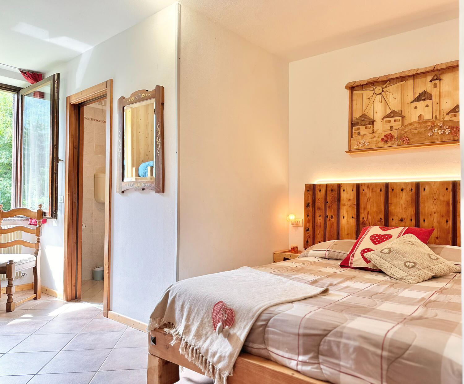 Ampia camera con letto matrimoniale + letto a castello, bagno con doccia. Mobili in legno rustico che scaldano l’ambiente.