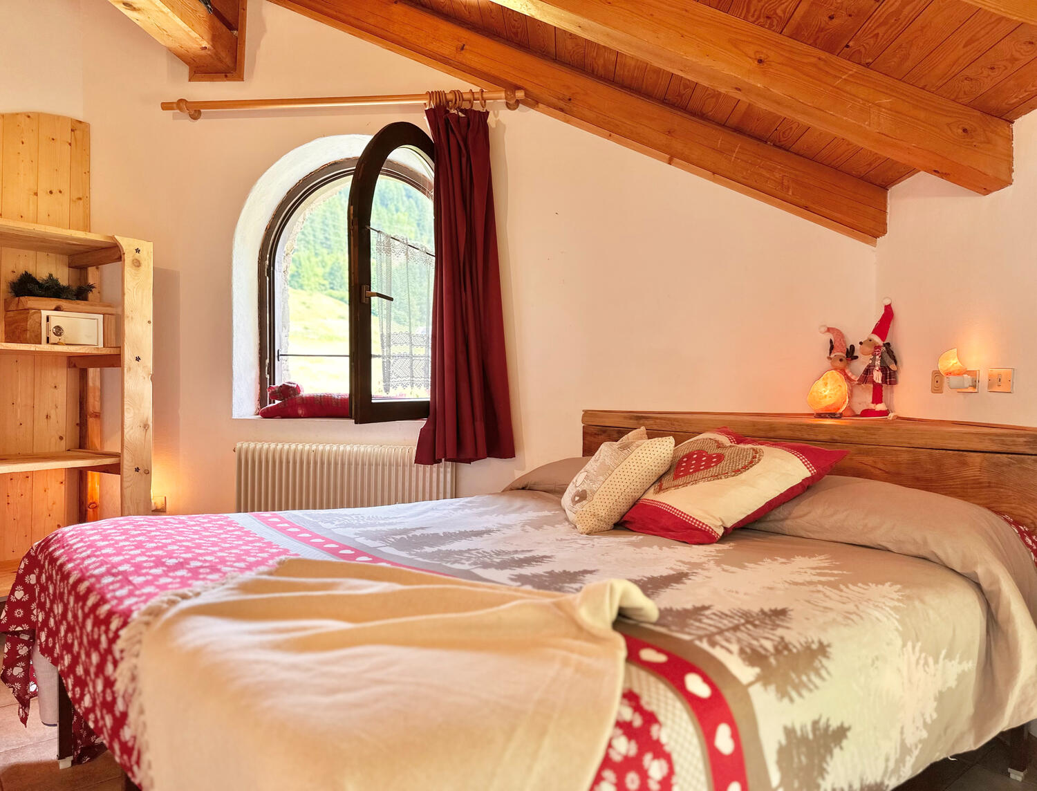 Camera matrimoniale dal fascino alpino, con letto a castello in legno, bagno privato dotato di doccia. Atmosfera calda grazie agli arredi in legno chiaro. Secondo piano.